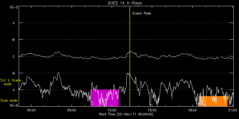 EIS Observation timeline overlay to GOES-Xray curve Code 1" 2" 40" 266" EIS Observations list for this event: STUDY ACRONYM ID DATE OBSERVED DESCRIPTION NOAA# TARGET 0 HPW021_VEL_240x512v1 | 25345 | 2011/12/22 10:25:41 | Active Region map. AR 11381 + 11382 | 1381 | Active Region TIMELINE ID DATE OBSERVED FITS FILE XCEN (+W/-E) YCEN (+N/-S) DUR ----------------------------------------------------------------------------------------------------------------- 25345 | 2011/12/22 10:25:41.000 | eis_l0_20111222_102541.fits.gz | 258.79 | -201.77 | 2h3m48s 1 cam_ar_limb_lite_v2 | 25346 | 2011/12/22 18:30:27 | Active Region Temperature Diagnostics. | | Active Region TIMELINE ID DATE OBSERVED FITS FILE XCEN (+W/-E) YCEN (+N/-S) DUR ----------------------------------------------------------------------------------------------------------------- 25346 | 2011/12/22 18:30:27.000 | eis_l0_20111222_183027.fits.gz | -9969.79 | -9963.20 | 2h6m : Check study information : Download file : View thumbnails For this event, also check for:
