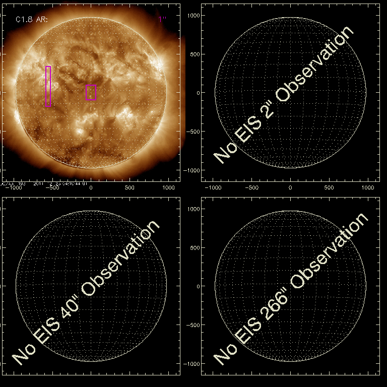 EIS Observation timeline overlay to GOES-Xray curve Code 1" 2" 40" 266" EIS Observations list for this event: STUDY ACRONYM ID DATE OBSERVED DESCRIPTION NOAA# TARGET 0 SYNOP006 | 25347 | 2011/12/22 22:32:27 | EIS sensitivity monitoring | | Quiet Sun TIMELINE ID DATE OBSERVED FITS FILE XCEN (+W/-E) YCEN (+N/-S) DUR ----------------------------------------------------------------------------------------------------------------- 25347 | 2011/12/22 22:32:27.000 | eis_l0_20111222_223227.fits.gz | -0.14 | -0.42 | 3h15m36s 1 HPW021_VEL_120x512v1 | 25348 | 2011/12/23 04:12:13 | Active Region map. AR 11384. | 1384 | Active Region TIMELINE ID DATE OBSERVED FITS FILE XCEN (+W/-E) YCEN (+N/-S) DUR ----------------------------------------------------------------------------------------------------------------- 25348 | 2011/12/23 04:12:13.000 | eis_l0_20111223_041213.fits.gz | -551.85 | 75.28 | 1h1m52s : Check study information : Download file : View thumbnails For this event, also check for: