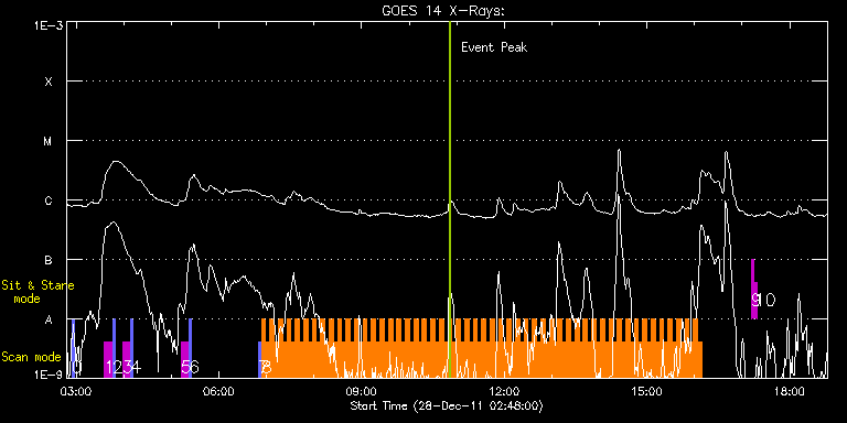 EIS Observation timeline overlay to GOES-Xray curve Code 1" 2" 40" 266" EIS Observations list for this event: STUDY ACRONYM ID DATE OBSERVED DESCRIPTION NOAA# TARGET 0 PRY_slot_contextLITE | 25430 | 2011/12/28 02:54:54 | HOP 79; Irradiance Scans | | Active Region TIMELINE ID DATE OBSERVED FITS FILE XCEN (+W/-E) YCEN (+N/-S) DUR ----------------------------------------------------------------------------------------------------------------- 25430 | 2011/12/28 02:54:54.000 | eis_l0_20111228_025454.fits.gz | -25.18 | 629.38 | 2m56s 1 SK_DEEP_5x512_SLIT1 | 25431 | 2011/12/28 03:35:20 | HOP 79; Irradiance Scans | | Quiet Sun TIMELINE ID DATE OBSERVED FITS FILE XCEN (+W/-E) YCEN (+N/-S) DUR ----------------------------------------------------------------------------------------------------------------- 25431 | 2011/12/28 03:35:20.000 | eis_l0_20111228_033520.fits.gz | -10.11 | 729.57 | 10m8s 2 PRY_slot_contextLITE | 25432 | 2011/12/28 03:45:53 | HOP 79; Irradiance Scans | | Active Region TIMELINE ID DATE OBSERVED FITS FILE XCEN (+W/-E) YCEN (+N/-S) DUR ----------------------------------------------------------------------------------------------------------------- 25432 | 2011/12/28 03:45:53.000 | eis_l0_20111228_034553.fits.gz | -25.33 | 729.72 | 2m57s 3 SK_DEEP_5x512_SLIT1 | 25433 | 2011/12/28 03:58:20 | HOP 79; Irradiance Scans | | Quiet Sun TIMELINE ID DATE OBSERVED FITS FILE XCEN (+W/-E) YCEN (+N/-S) DUR ----------------------------------------------------------------------------------------------------------------- 25433 | 2011/12/28 03:58:20.000 | eis_l0_20111228_035820.fits.gz | -10.11 | 829.68 | 10m8s 4 PRY_slot_contextLITE | 25434 | 2011/12/28 04:08:54 | HOP 79; Irradiance Scans | | Active Region TIMELINE ID DATE OBSERVED FITS FILE XCEN (+W/-E) YCEN (+N/-S) DUR ----------------------------------------------------------------------------------------------------------------- 25434 | 2011/12/28 04:08:54.000 | eis_l0_20111228_040854.fits.gz | -25.33 | 829.68 | 2m56s 5 SK_DEEP_5x512_SLIT1 | 25435 | 2011/12/28 05:12:19 | HOP 79; Irradiance Scans | | Quiet Sun TIMELINE ID DATE OBSERVED FITS FILE XCEN (+W/-E) YCEN (+N/-S) DUR ----------------------------------------------------------------------------------------------------------------- 25435 | 2011/12/28 05:12:19.000 | eis_l0_20111228_051219.fits.gz | -10.11 | 929.41 | 10m8s 6 PRY_slot_contextLITE | 25436 | 2011/12/28 05:22:52 | HOP 79; Irradiance Scans | | Active Region TIMELINE ID DATE OBSERVED FITS FILE XCEN (+W/-E) YCEN (+N/-S) DUR ----------------------------------------------------------------------------------------------------------------- 25436 | 2011/12/28 05:22:52.000 | eis_l0_20111228_052252.fits.gz | -25.33 | 929.48 | 2m57s 7 PRY_slot_contextLITE | 25440 | 2011/12/28 06:50:13 | Active Region Studies | 1380 | Active Region TIMELINE ID DATE OBSERVED FITS FILE XCEN (+W/-E) YCEN (+N/-S) DUR ----------------------------------------------------------------------------------------------------------------- 25440 | 2011/12/28 06:50:13.000 | eis_l0_20111228_065013.fits.gz | 760.04 | -351.59 | 2m56s 8 HH_Flare+AR_180x152 | 25441 | 2011/12/28 06:53:35 | Active Region Studies | 1380 | Flare TIMELINE ID DATE OBSERVED FITS FILE XCEN (+W/-E) YCEN (+N/-S) DUR ----------------------------------------------------------------------------------------------------------------- 25441 | 2011/12/28 06:53:35.000 | eis_l0_20111228_065335.fits.gz | 773.34 | -351.82 | 5m16s 25441 | 2011/12/28 06:58:54.000 | eis_l0_20111228_065854.fits.gz | 773.65 | -351.90 | 5m18s 25441 | 2011/12/28 07:04:15.000 | eis_l0_20111228_070415.fits.gz | 774.04 | -351.90 | 5m17s 25441 | 2011/12/28 07:09:35.000 | eis_l0_20111228_070935.fits.gz | 774.43 | -351.90 | 5m18s 25441 | 2011/12/28 07:14:56.000 | eis_l0_20111228_071456.fits.gz | 774.81 | -351.90 | 5m17s 25441 | 2011/12/28 07:20:16.000 | eis_l0_20111228_072016.fits.gz | 775.20 | -351.98 | 5m19s 25441 | 2011/12/28 07:25:38.000 | eis_l0_20111228_072538.fits.gz | 775.59 | -351.82 | 5m18s 25441 | 2011/12/28 07:30:58.000 | eis_l0_20111228_073058.fits.gz | 775.97 | -352.13 | 5m18s 25441 | 2011/12/28 07:36:18.000 | eis_l0_20111228_073618.fits.gz | 776.43 | -352.13 | 5m19s 25441 | 2011/12/28 07:41:40.000 | eis_l0_20111228_074140.fits.gz | 776.74 | -352.13 | 5m17s 25441 | 2011/12/28 07:47:00.000 | eis_l0_20111228_074700.fits.gz | 777.28 | -352.21 | 5m18s 25441 | 2011/12/28 07:52:21.000 | eis_l0_20111228_075221.fits.gz | 777.59 | -352.13 | 5m18s 25441 | 2011/12/28 07:57:42.000 | eis_l0_20111228_075742.fits.gz | 778.06 | -352.05 | 5m17s 25441 | 2011/12/28 08:03:02.000 | eis_l0_20111228_080302.fits.gz | 778.29 | -352.29 | 5m17s 25441 | 2011/12/28 08:08:22.000 | eis_l0_20111228_080822.fits.gz | 778.67 | -352.21 | 5m18s 25441 | 2011/12/28 08:13:43.000 | eis_l0_20111228_081343.fits.gz | 779.14 | -352.36 | 5m17s 25441 | 2011/12/28 08:19:03.000 | eis_l0_20111228_081903.fits.gz | 779.45 | -352.21 | 5m18s 25441 | 2011/12/28 08:24:24.000 | eis_l0_20111228_082424.fits.gz | 779.83 | -352.13 | 5m18s 25441 | 2011/12/28 08:29:45.000 | eis_l0_20111228_082945.fits.gz | 780.30 | -352.21 | 5m18s 25441 | 2011/12/28 08:35:05.000 | eis_l0_20111228_083505.fits.gz | 780.61 | -352.29 | 5m18s 25441 | 2011/12/28 08:40:26.000 | eis_l0_20111228_084026.fits.gz | 780.99 | -352.29 | 5m18s 25441 | 2011/12/28 08:45:47.000 | eis_l0_20111228_084547.fits.gz | 781.30 | -352.36 | 5m17s 25441 | 2011/12/28 08:51:07.000 | eis_l0_20111228_085107.fits.gz | 781.77 | -352.36 | 5m17s 25441 | 2011/12/28 08:56:27.000 | eis_l0_20111228_085627.fits.gz | 782.15 | -352.52 | 5m18s 25441 | 2011/12/28 09:01:48.000 | eis_l0_20111228_090148.fits.gz | 782.46 | -352.36 | 5m18s 25441 | 2011/12/28 09:07:08.000 | eis_l0_20111228_090708.fits.gz | 782.85 | -352.36 | 5m19s 25441 | 2011/12/28 09:12:30.000 | eis_l0_20111228_091230.fits.gz | 783.31 | -352.60 | 5m18s 25441 | 2011/12/28 09:17:50.000 | eis_l0_20111228_091750.fits.gz | 783.62 | -352.44 | 5m18s 25441 | 2011/12/28 09:23:11.000 | eis_l0_201112