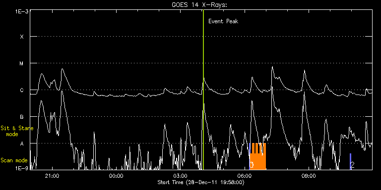 EIS Observation timeline overlay to GOES-Xray curve Code 1" 2" 40" 266" EIS Observations list for this event: STUDY ACRONYM ID DATE OBSERVED DESCRIPTION NOAA# TARGET 0 PRY_slot_contextLITE | 25447 | 2011/12/29 06:12:19 | Active Region Studies | 1387 | Active Region TIMELINE ID DATE OBSERVED FITS FILE XCEN (+W/-E) YCEN (+N/-S) DUR ----------------------------------------------------------------------------------------------------------------- 25447 | 2011/12/29 06:12:19.000 | eis_l0_20111229_061219.fits.gz | 842.70 | -358.93 | 2m56s 1 HH_Flare+AR_180x152 | 25448 | 2011/12/29 06:15:41 | Active Region Studies | 1387 | Flare TIMELINE ID DATE OBSERVED FITS FILE XCEN (+W/-E) YCEN (+N/-S) DUR ----------------------------------------------------------------------------------------------------------------- 25448 | 2011/12/29 06:15:41.000 | eis_l0_20111229_061541.fits.gz | 855.85 | -358.85 | 5m18s 25448 | 2011/12/29 06:21:02.000 | eis_l0_20111229_062102.fits.gz | 855.92 | -358.62 | 5m17s 25448 | 2011/12/29 06:26:22.000 | eis_l0_20111229_062622.fits.gz | 856.16 | -358.77 | 5m17s 25448 | 2011/12/29 06:31:42.000 | eis_l0_20111229_063142.fits.gz | 856.46 | -358.70 | 5m18s 25448 | 2011/12/29 06:37:02.000 | eis_l0_20111229_063702.fits.gz | 856.70 | -358.85 | 5m19s 25448 | 2011/12/29 06:42:23.000 | eis_l0_20111229_064223.fits.gz | 856.93 | -358.85 | 5m19s 25448 | 2011/12/29 06:47:45.000 | eis_l0_20111229_064745.fits.gz | 857.16 | -358.85 | 5m18s 25448 | 2011/12/29 06:53:06.000 | eis_l0_20111229_065306.fits.gz | 857.39 | -358.85 | 5m17s 2 PRY_slot_contextLITE | 25492 | 2011/12/29 10:55:21 | Plage observation - Hara | 1386 | Active Region TIMELINE ID DATE OBSERVED FITS FILE XCEN (+W/-E) YCEN (+N/-S) DUR ----------------------------------------------------------------------------------------------------------------- 25492 | 2011/12/29 10:55:21.000 | eis_l0_20111229_105521.fits.gz | -205.24 | -299.60 | 2m56s : Check study information : Download file : View thumbnails For this event, also check for: