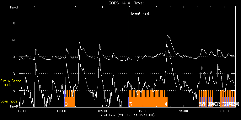 EIS Observation timeline overlay to GOES-Xray curve Code 1" 2" 40" 266" EIS Observations list for this event: STUDY ACRONYM ID DATE OBSERVED DESCRIPTION NOAA# TARGET 0 PRY_slot_contextLITE | 25447 | 2011/12/29 06:12:19 | Active Region Studies | 1387 | Active Region TIMELINE ID DATE OBSERVED FITS FILE XCEN (+W/-E) YCEN (+N/-S) DUR ----------------------------------------------------------------------------------------------------------------- 25447 | 2011/12/29 06:12:19.000 | eis_l0_20111229_061219.fits.gz | 842.70 | -358.93 | 2m56s 1 HH_Flare+AR_180x152 | 25448 | 2011/12/29 06:15:41 | Active Region Studies | 1387 | Flare TIMELINE ID DATE OBSERVED FITS FILE XCEN (+W/-E) YCEN (+N/-S) DUR ----------------------------------------------------------------------------------------------------------------- 25448 | 2011/12/29 06:15:41.000 | eis_l0_20111229_061541.fits.gz | 855.85 | -358.85 | 5m18s 25448 | 2011/12/29 06:21:02.000 | eis_l0_20111229_062102.fits.gz | 855.92 | -358.62 | 5m17s 25448 | 2011/12/29 06:26:22.000 | eis_l0_20111229_062622.fits.gz | 856.16 | -358.77 | 5m17s 25448 | 2011/12/29 06:31:42.000 | eis_l0_20111229_063142.fits.gz | 856.46 | -358.70 | 5m18s 25448 | 2011/12/29 06:37:02.000 | eis_l0_20111229_063702.fits.gz | 856.70 | -358.85 | 5m19s 25448 | 2011/12/29 06:42:23.000 | eis_l0_20111229_064223.fits.gz | 856.93 | -358.85 | 5m19s 25448 | 2011/12/29 06:47:45.000 | eis_l0_20111229_064745.fits.gz | 857.16 | -358.85 | 5m18s 25448 | 2011/12/29 06:53:06.000 | eis_l0_20111229_065306.fits.gz | 857.39 | -358.85 | 5m17s 2 PRY_slot_contextLITE | 25492 | 2011/12/29 10:55:21 | Plage observation - Hara | 1386 | Active Region TIMELINE ID DATE OBSERVED FITS FILE XCEN (+W/-E) YCEN (+N/-S) DUR ----------------------------------------------------------------------------------------------------------------- 25492 | 2011/12/29 10:55:21.000 | eis_l0_20111229_105521.fits.gz | -205.24 | -299.60 | 2m56s 3 HH_Flare_180x152f | 25493 | 2011/12/29 10:58:42 | Plage observation - Hara | 1386 | Flare TIMELINE ID DATE OBSERVED FITS FILE XCEN (+W/-E) YCEN (+N/-S) DUR ----------------------------------------------------------------------------------------------------------------- 25493 | 2011/12/29 10:58:42.000 | eis_l0_20111229_105842.fits.gz | -191.79 | -299.60 | 2m47s 25493 | 2011/12/29 11:01:32.000 | eis_l0_20111229_110132.fits.gz | -191.32 | -299.68 | 2m47s 25493 | 2011/12/29 11:04:22.000 | eis_l0_20111229_110422.fits.gz | -190.86 | -299.53 | 2m47s 25493 | 2011/12/29 11:07:12.000 | eis_l0_20111229_110712.fits.gz | -190.47 | -299.53 | 2m48s 25493 | 2011/12/29 11:10:02.000 | eis_l0_20111229_111002.fits.gz | -190.09 | -299.53 | 2m48s 25493 | 2011/12/29 11:12:53.000 | eis_l0_20111229_111253.fits.gz | -189.70 | -299.68 | 2m48s 25493 | 2011/12/29 11:15:43.000 | eis_l0_20111229_111543.fits.gz | -189.31 | -299.53 | 2m47s 25493 | 2011/12/29 11:18:33.000 | eis_l0_20111229_111833.fits.gz | -189.01 | -299.60 | 2m48s 25493 | 2011/12/29 11:21:23.000 | eis_l0_20111229_112123.fits.gz | -188.46 | -299.76 | 2m48s 25493 | 2011/12/29 11:24:14.000 | eis_l0_20111229_112414.fits.gz | -188.08 | -299.53 | 2m48s 25493 | 2011/12/29 11:27:05.000 | eis_l0_20111229_112705.fits.gz | -187.69 | -299.53 | 2m48s 25493 | 2011/12/29 11:29:55.000 | eis_l0_20111229_112955.fits.gz | -187.31 | -299.60 | 2m48s 25493 | 2011/12/29 11:32:46.000 | eis_l0_20111229_113246.fits.gz | -186.92 | -299.53 | 2m47s 25493 | 2011/12/29 11:35:36.000 | eis_l0_20111229_113536.fits.gz | -186.53 | -299.53 | 2m47s 25493 | 2011/12/29 11:38:26.000 | eis_l0_20111229_113826.fits.gz | -186.07 | -299.53 | 2m47s 25493 | 2011/12/29 11:41:16.000 | eis_l0_20111229_114116.fits.gz | -185.68 | -299.45 | 2m48s 25493 | 2011/12/29 11:44:06.000 | eis_l0_20111229_114406.fits.gz | -185.22 | -299.60 | 2m47s 25493 | 2011/12/29 11:46:56.000 | eis_l0_20111229_114656.fits.gz | -184.83 | -299.53 | 2m48s 25493 | 2011/12/29 11:49:47.000 | eis_l0_20111229_114947.fits.gz | -184.45 | -299.37 | 2m47s 25493 | 2011/12/29 11:52:36.000 | eis_l0_20111229_115236.fits.gz | -184.14 | -299.37 | 2m48s 25493 | 2011/12/29 11:55:27.000 | eis_l0_20111229_115527.fits.gz | -183.68 | -299.45 | 2m48s 25493 | 2011/12/29 11:58:18.000 | eis_l0_20111229_115818.fits.gz | -183.21 | -299.53 | 2m48s 25493 | 2011/12/29 12:01:09.000 | eis_l0_20111229_120109.fits.gz | -182.90 | -299.45 | 2m47s 25493 | 2011/12/29 12:03:59.000 | eis_l0_20111229_120359.fits.gz | -182.52 | -299.45 | 2m47s 25493 | 2011/12/29 12:06:49.000 | eis_l0_20111229_120649.fits.gz | -182.05 | -299.37 | 2m47s 25493 | 2011/12/29 12:09:39.000 | eis_l0_20111229_120939.fits.gz | -181.59 | -299.37 | 2m48s 25493 | 2011/12/29 12:12:30.000 | eis_l0_20111229_121230.fits.gz | -181.28 | -299.37 | 2m47s 25493 | 2011/12/29 12:15:20.000 | eis_l0_20111229_121520.fits.gz | -180.82 | -299.29 | 2m49s 25493 | 2011/12/29 12:18:11.000 | eis_l0_20111229_121811.fits.gz | -180.43 | -299.29 | 2m49s 25493 | 2011/12/29 12:21:03.000 | eis_l0_20111229_122103.fits.gz | -180.04 | -299.29 | 2m48s 25493 | 2011/12/29 12:23:54.000 | eis_l0_20111229_122354.fits.gz | -179.58 | -299.29 | 2m47s 25493 | 2011/12/29 12:26:44.000 | eis_l0_20111229_122644.fits.gz | -179.20 | -299.37 | 2m48s 25493 | 2011/12/29 12:29:34.000 | eis_l0_20111229_122934.fits.gz | -178.73 | -299.37 | 2m48s 25493 | 2011/12/29 12:32:25.000 | eis_l0_20111229_123225.fits.gz | -178.35 | -299.37 | 2m47s 25493 | 2011/12/29 12:35:15.000 | eis_l0_20111229_123515.fits.gz | -177.96 | -299.29 | 2m48s 25493 | 2011/12/29 12:38:06.000 | eis_l0_20111229_123806.fits.gz | -177.49 | -299.29 | 2m48s 25493 | 2011/12/29 12:40:57.000 | eis_l0_20111229_124057.fits.gz | -177.19 | -299.29 | 2m47s 25493 | 2011/12/29 12:43:47.000 | eis_l0_20111229_124347.fits.gz | -176.80 | -299.22 | 2m47s 25493 | 2011/12/29 12:46:37.000 | eis_l0_20111229_124637.fits.gz | -176.34 | -299.29 | 2m48s 25493 | 2011/12/29 12:49:28.000 | eis_l0_20111229_124928.fits.gz | -175.95 | -299.37 | 2m47s 25493 | 2011/12/29 12:52:18.000 | eis_l0_20111229_125218.fits.gz | -175.64 | -299.22 | 