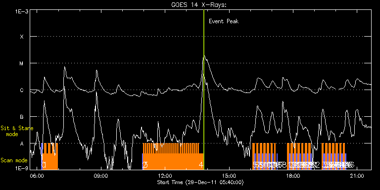 EIS Observation timeline overlay to GOES-Xray curve Code 1" 2" 40" 266" EIS Observations list for this event: STUDY ACRONYM ID DATE OBSERVED DESCRIPTION NOAA# TARGET 0 PRY_slot_contextLITE | 25447 | 2011/12/29 06:12:19 | Active Region Studies | 1387 | Active Region TIMELINE ID DATE OBSERVED FITS FILE XCEN (+W/-E) YCEN (+N/-S) DUR ----------------------------------------------------------------------------------------------------------------- 25447 | 2011/12/29 06:12:19.000 | eis_l0_20111229_061219.fits.gz | 842.70 | -358.93 | 2m56s 1 HH_Flare+AR_180x152 | 25448 | 2011/12/29 06:15:41 | Active Region Studies | 1387 | Flare TIMELINE ID DATE OBSERVED FITS FILE XCEN (+W/-E) YCEN (+N/-S) DUR ----------------------------------------------------------------------------------------------------------------- 25448 | 2011/12/29 06:15:41.000 | eis_l0_20111229_061541.fits.gz | 855.85 | -358.85 | 5m18s 25448 | 2011/12/29 06:21:02.000 | eis_l0_20111229_062102.fits.gz | 855.92 | -358.62 | 5m17s 25448 | 2011/12/29 06:26:22.000 | eis_l0_20111229_062622.fits.gz | 856.16 | -358.77 | 5m17s 25448 | 2011/12/29 06:31:42.000 | eis_l0_20111229_063142.fits.gz | 856.46 | -358.70 | 5m18s 25448 | 2011/12/29 06:37:02.000 | eis_l0_20111229_063702.fits.gz | 856.70 | -358.85 | 5m19s 25448 | 2011/12/29 06:42:23.000 | eis_l0_20111229_064223.fits.gz | 856.93 | -358.85 | 5m19s 25448 | 2011/12/29 06:47:45.000 | eis_l0_20111229_064745.fits.gz | 857.16 | -358.85 | 5m18s 25448 | 2011/12/29 06:53:06.000 | eis_l0_20111229_065306.fits.gz | 857.39 | -358.85 | 5m17s 2 PRY_slot_contextLITE | 25492 | 2011/12/29 10:55:21 | Plage observation - Hara | 1386 | Active Region TIMELINE ID DATE OBSERVED FITS FILE XCEN (+W/-E) YCEN (+N/-S) DUR ----------------------------------------------------------------------------------------------------------------- 25492 | 2011/12/29 10:55:21.000 | eis_l0_20111229_105521.fits.gz | -205.24 | -299.60 | 2m56s 3 HH_Flare_180x152f | 25493 | 2011/12/29 10:58:42 | Plage observation - Hara | 1386 | Flare TIMELINE ID DATE OBSERVED FITS FILE XCEN (+W/-E) YCEN (+N/-S) DUR ----------------------------------------------------------------------------------------------------------------- 25493 | 2011/12/29 10:58:42.000 | eis_l0_20111229_105842.fits.gz | -191.79 | -299.60 | 2m47s 25493 | 2011/12/29 11:01:32.000 | eis_l0_20111229_110132.fits.gz | -191.32 | -299.68 | 2m47s 25493 | 2011/12/29 11:04:22.000 | eis_l0_20111229_110422.fits.gz | -190.86 | -299.53 | 2m47s 25493 | 2011/12/29 11:07:12.000 | eis_l0_20111229_110712.fits.gz | -190.47 | -299.53 | 2m48s 25493 | 2011/12/29 11:10:02.000 | eis_l0_20111229_111002.fits.gz | -190.09 | -299.53 | 2m48s 25493 | 2011/12/29 11:12:53.000 | eis_l0_20111229_111253.fits.gz | -189.70 | -299.68 | 2m48s 25493 | 2011/12/29 11:15:43.000 | eis_l0_20111229_111543.fits.gz | -189.31 | -299.53 | 2m47s 25493 | 2011/12/29 11:18:33.000 | eis_l0_20111229_111833.fits.gz | -189.01 | -299.60 | 2m48s 25493 | 2011/12/29 11:21:23.000 | eis_l0_20111229_112123.fits.gz | -188.46 | -299.76 | 2m48s 25493 | 2011/12/29 11:24:14.000 | eis_l0_20111229_112414.fits.gz | -188.08 | -299.53 | 2m48s 25493 | 2011/12/29 11:27:05.000 | eis_l0_20111229_112705.fits.gz | -187.69 | -299.53 | 2m48s 25493 | 2011/12/29 11:29:55.000 | eis_l0_20111229_112955.fits.gz | -187.31 | -299.60 | 2m48s 25493 | 2011/12/29 11:32:46.000 | eis_l0_20111229_113246.fits.gz | -186.92 | -299.53 | 2m47s 25493 | 2011/12/29 11:35:36.000 | eis_l0_20111229_113536.fits.gz | -186.53 | -299.53 | 2m47s 25493 | 2011/12/29 11:38:26.000 | eis_l0_20111229_113826.fits.gz | -186.07 | -299.53 | 2m47s 25493 | 2011/12/29 11:41:16.000 | eis_l0_20111229_114116.fits.gz | -185.68 | -299.45 | 2m48s 25493 | 2011/12/29 11:44:06.000 | eis_l0_20111229_114406.fits.gz | -185.22 | -299.60 | 2m47s 25493 | 2011/12/29 11:46:56.000 | eis_l0_20111229_114656.fits.gz | -184.83 | -299.53 | 2m48s 25493 | 2011/12/29 11:49:47.000 | eis_l0_20111229_114947.fits.gz | -184.45 | -299.37 | 2m47s 25493 | 2011/12/29 11:52:36.000 | eis_l0_20111229_115236.fits.gz | -184.14 | -299.37 | 2m48s 25493 | 2011/12/29 11:55:27.000 | eis_l0_20111229_115527.fits.gz | -183.68 | -299.45 | 2m48s 25493 | 2011/12/29 11:58:18.000 | eis_l0_20111229_115818.fits.gz | -183.21 | -299.53 | 2m48s 25493 | 2011/12/29 12:01:09.000 | eis_l0_20111229_120109.fits.gz | -182.90 | -299.45 | 2m47s 25493 | 2011/12/29 12:03:59.000 | eis_l0_20111229_120359.fits.gz | -182.52 | -299.45 | 2m47s 25493 | 2011/12/29 12:06:49.000 | eis_l0_20111229_120649.fits.gz | -182.05 | -299.37 | 2m47s 25493 | 2011/12/29 12:09:39.000 | eis_l0_20111229_120939.fits.gz | -181.59 | -299.37 | 2m48s 25493 | 2011/12/29 12:12:30.000 | eis_l0_20111229_121230.fits.gz | -181.28 | -299.37 | 2m47s 25493 | 2011/12/29 12:15:20.000 | eis_l0_20111229_121520.fits.gz | -180.82 | -299.29 | 2m49s 25493 | 2011/12/29 12:18:11.000 | eis_l0_20111229_121811.fits.gz | -180.43 | -299.29 | 2m49s 25493 | 2011/12/29 12:21:03.000 | eis_l0_20111229_122103.fits.gz | -180.04 | -299.29 | 2m48s 25493 | 2011/12/29 12:23:54.000 | eis_l0_20111229_122354.fits.gz | -179.58 | -299.29 | 2m47s 25493 | 2011/12/29 12:26:44.000 | eis_l0_20111229_122644.fits.gz | -179.20 | -299.37 | 2m48s 25493 | 2011/12/29 12:29:34.000 | eis_l0_20111229_122934.fits.gz | -178.73 | -299.37 | 2m48s 25493 | 2011/12/29 12:32:25.000 | eis_l0_20111229_123225.fits.gz | -178.35 | -299.37 | 2m47s 25493 | 2011/12/29 12:35:15.000 | eis_l0_20111229_123515.fits.gz | -177.96 | -299.29 | 2m48s 25493 | 2011/12/29 12:38:06.000 | eis_l0_20111229_123806.fits.gz | -177.49 | -299.29 | 2m48s 25493 | 2011/12/29 12:40:57.000 | eis_l0_20111229_124057.fits.gz | -177.19 | -299.29 | 2m47s 25493 | 2011/12/29 12:43:47.000 | eis_l0_20111229_124347.fits.gz | -176.80 | -299.22 | 2m47s 25493 | 2011/12/29 12:46:37.000 | eis_l0_20111229_124637.fits.gz | -176.34 | -299.29 | 2m48s 25493 | 2011/12/29 12:49:28.000 | eis_l0_20111229_124928.fits.gz | -175.95 | -299.37 | 2m47s 25493 | 2011/12/29 12:52:18.000 | eis_l0_20111229_125218.fits.gz | -175.64 | -299.22 | 