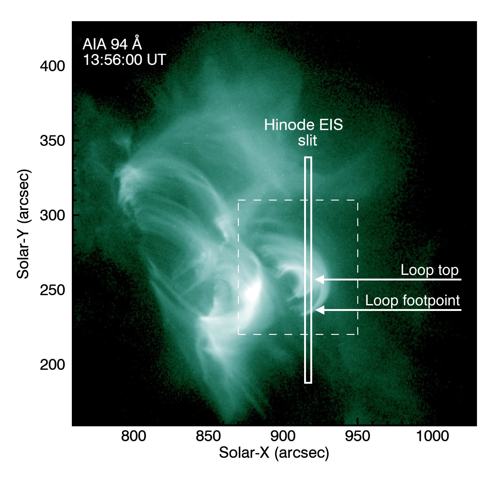 Figure 1: Context AIA 94 Å image of the flare loops associated with the M3.9 flare peaking at 13:56 UT on 2022 April 2. The solid white rectangle indicates the position of the EIS slit for the Fe XII 195.119 Å window, and the dashed white rectangle shows the loop arcade studied in this work.
