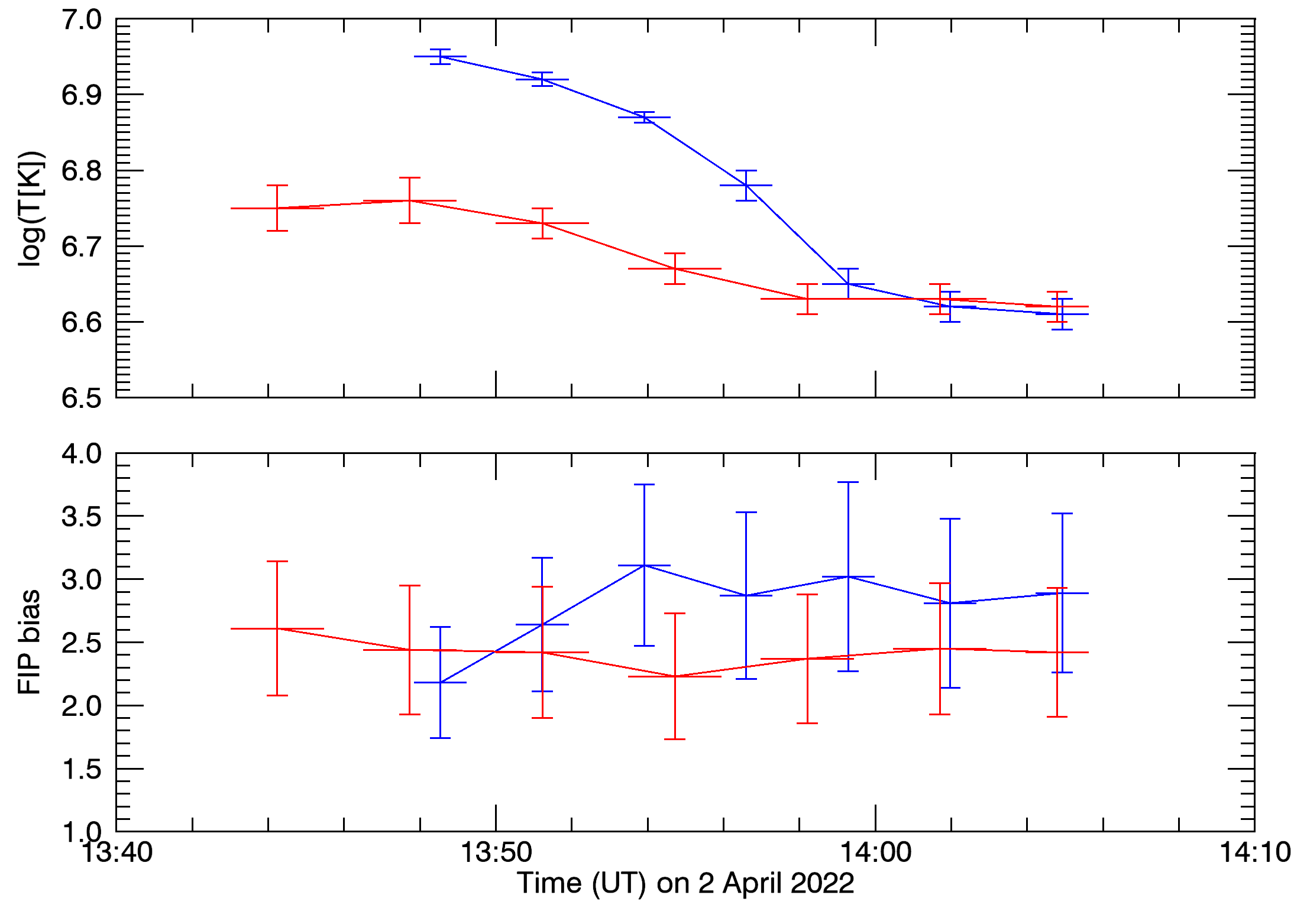 Figure 2: Evolution of Gaussian DEM centroid temperature (top) and associated FIP bias (bottom) for the loop top (blue) and loop footpoint (red).