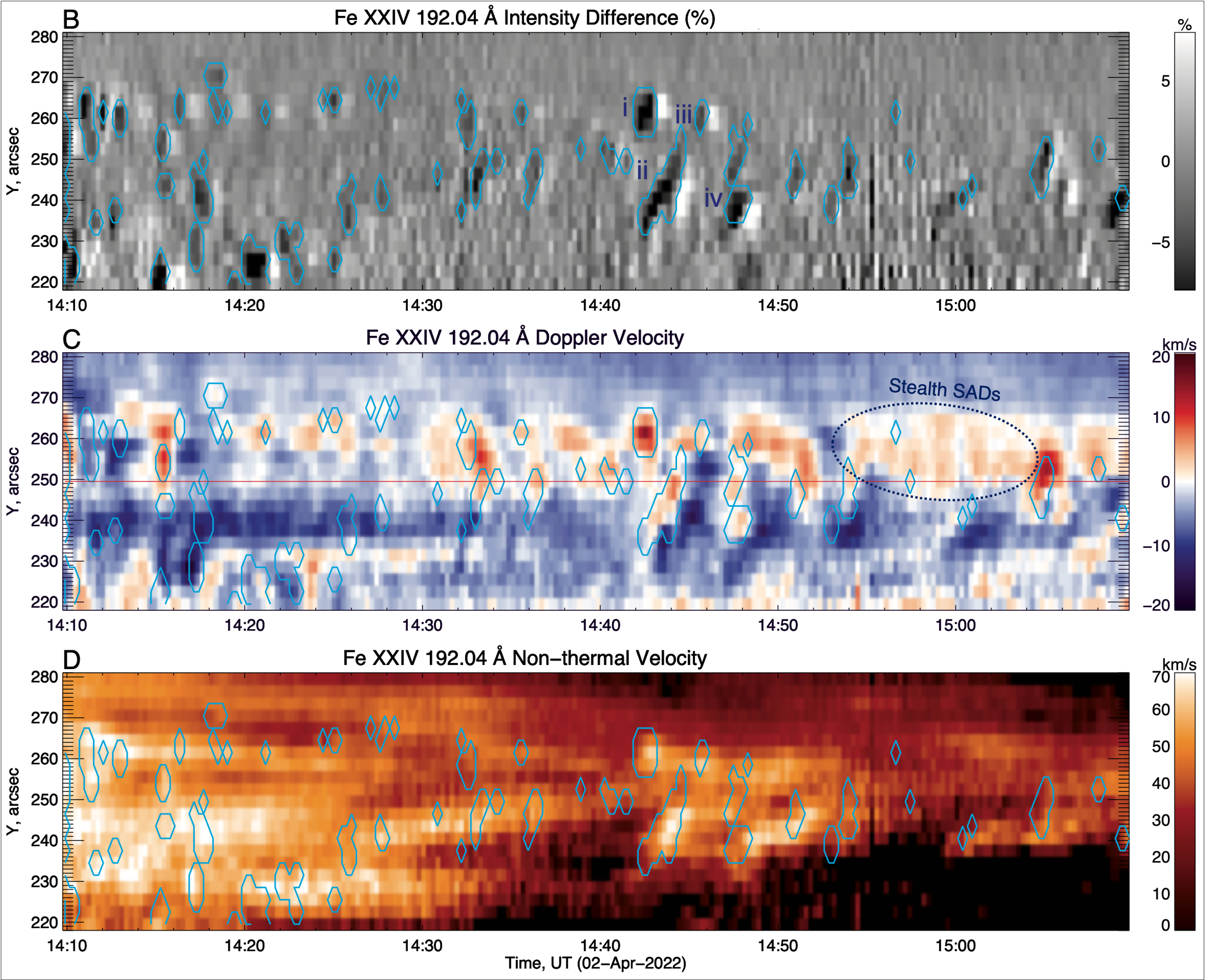 Figure 2: Panels (B)-(D): EIS Fe XXIV 192.02 Å intensity running percentage difference, Doppler velocity, and nonthermal velocity, respectively. The cyan contours mark the location of our individual SADs identified from the running difference map in panel (B).