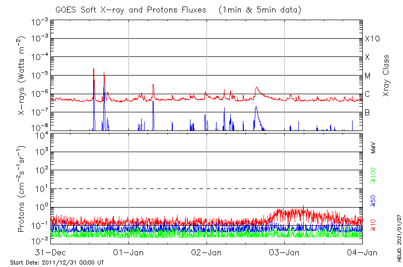This page provides light-curves generated from GOES soft X-ray and Particle data for the date indicated at the top and the preceding three days.