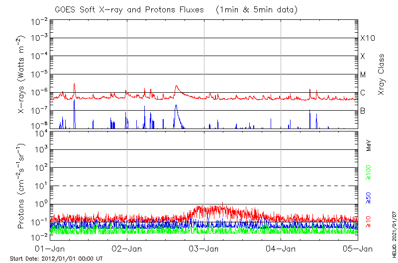 This page provides light-curves generated from GOES soft X-ray and Particle data for the date indicated at the top and the preceding three days.