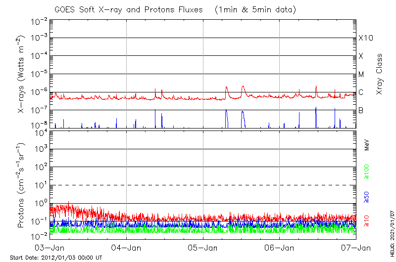 This page provides light-curves generated from GOES soft X-ray and Particle data for the date indicated at the top and the preceding three days.