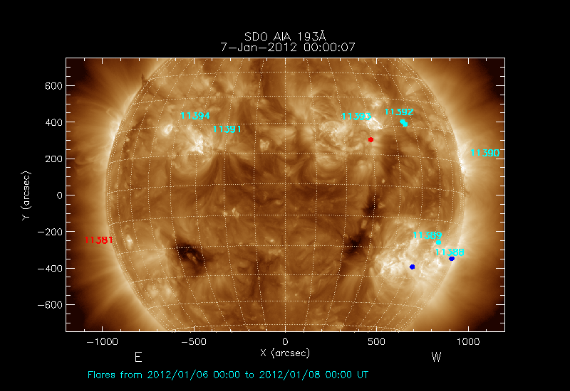 The most recent flares (≤12 hours) are shown as red dots, 12-24 hours ago as blue dots and older ones as turquoise dots.