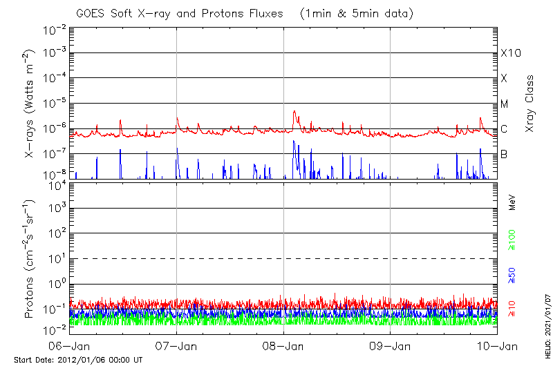 This page provides light-curves generated from GOES soft X-ray and Particle data for the date indicated at the top and the preceding three days.