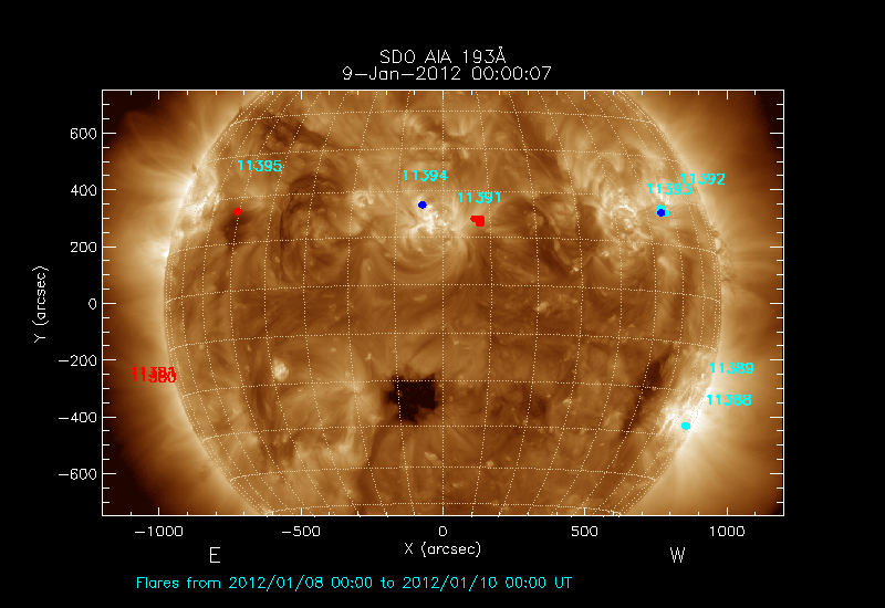 The most recent flares (≤12 hours) are shown as red dots, 12-24 hours ago as blue dots and older ones as turquoise dots.