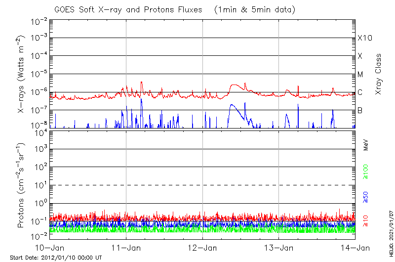 This page provides light-curves generated from GOES soft X-ray and Particle data for the date indicated at the top and the preceding three days.