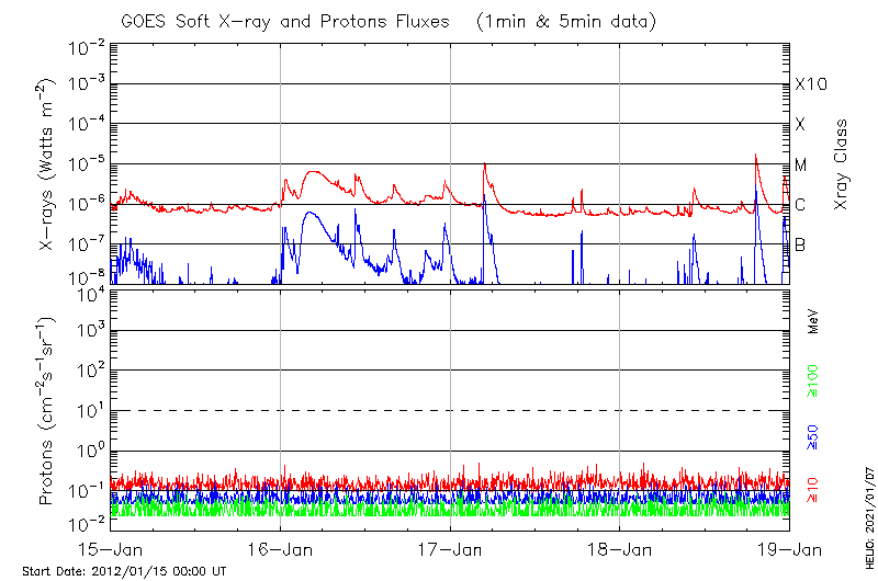 This page provides light-curves generated from GOES soft X-ray and Particle data for the date indicated at the top and the preceding three days.