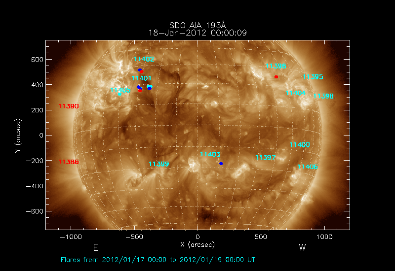 All soft X-ray flares (≥A1.0) where the location has been determined are shown; the flare locations are rotated to the time of the image