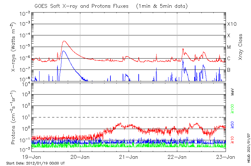 This page provides light-curves generated from GOES soft X-ray and Particle data for the date indicated at the top and the preceding three days.