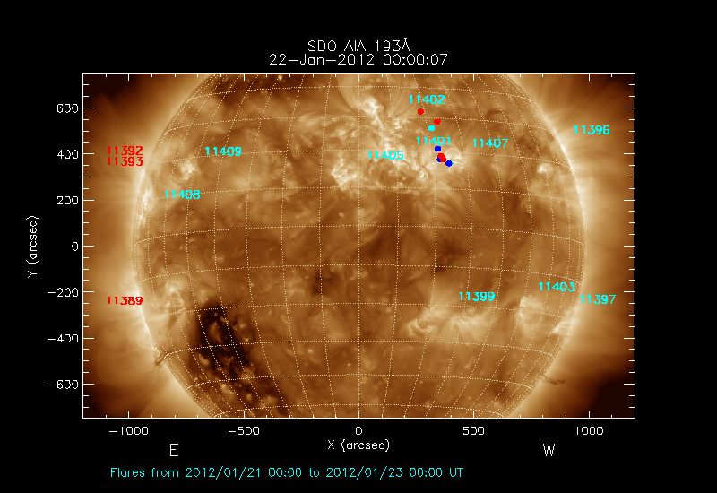 The most recent flares (≤12 hours) are shown as red dots, 12-24 hours ago as blue dots and older ones as turquoise dots.