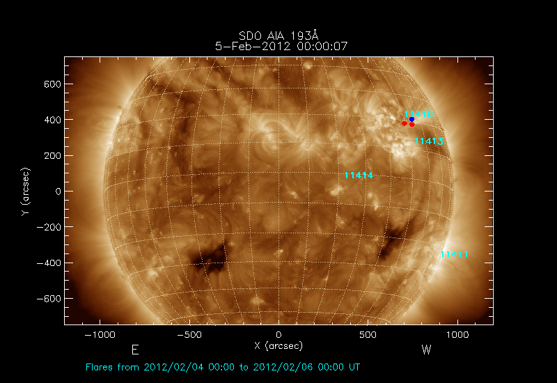 dots and 24-48 hours as turquoise dots; the flare locations are rotated to the time of the image.