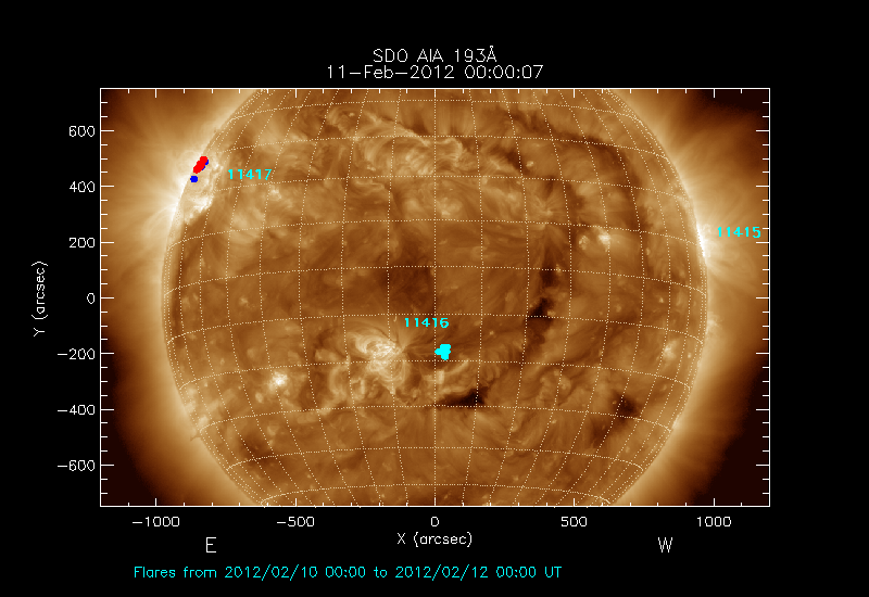 All soft X-ray flares (≥A1.0) where the location has been determined are shown; the flare locations are rotated to the time of the image