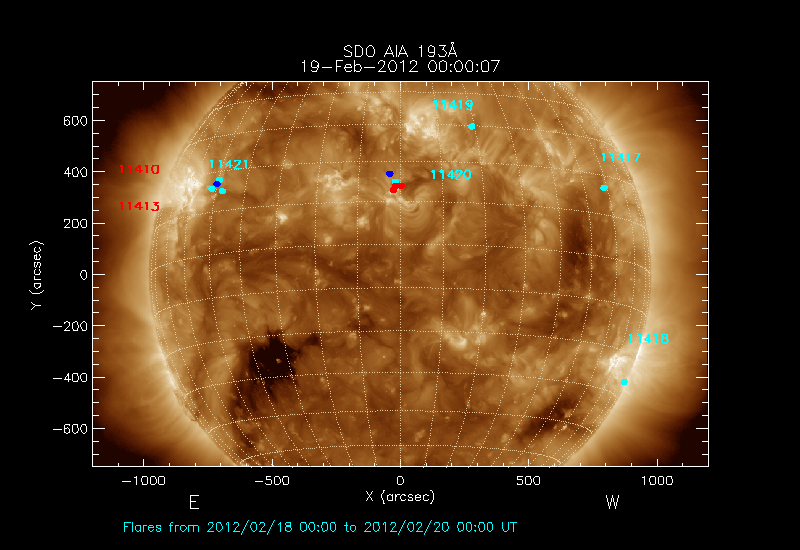 The most recent flares (≤12 hours) are shown as red dots, 12-24 hours ago as blue dots and older ones as turquoise dots.