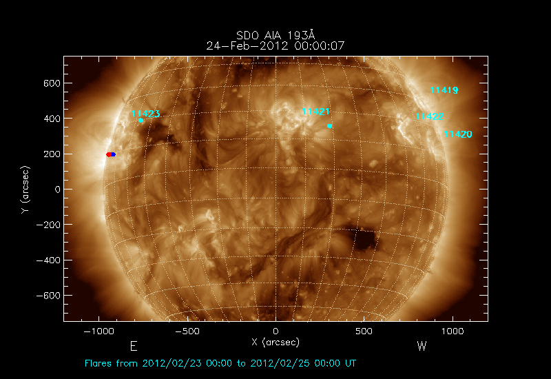 dots and 24-48 hours as turquoise dots; the flare locations are rotated to the time of the image.