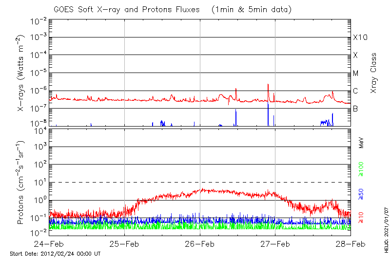 This page provides light-curves generated from GOES soft X-ray and Particle data for the date indicated at the top and the preceding three days.