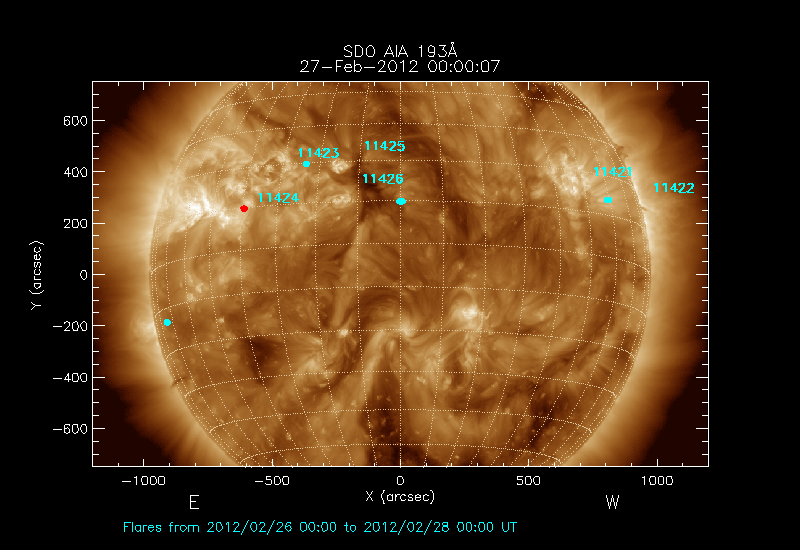 The locations of the flares over-plotted on the image are derived from the flare catalogue