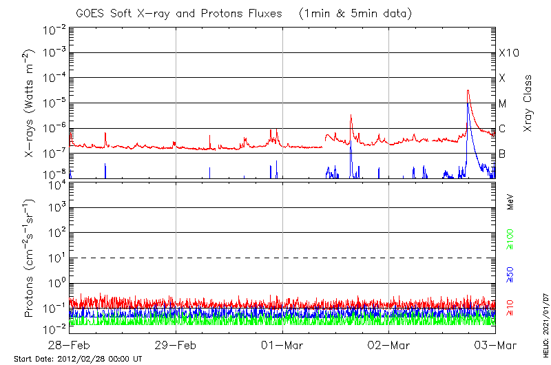 This page provides light-curves generated from GOES soft X-ray and Particle data for the date indicated at the top and the preceding three days.