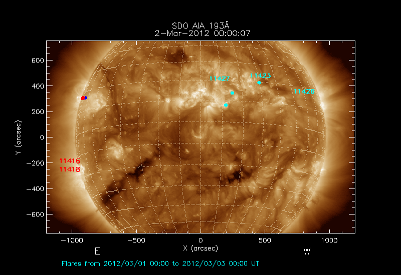 The locations of the flares over-plotted on the image are derived from the flare catalogue