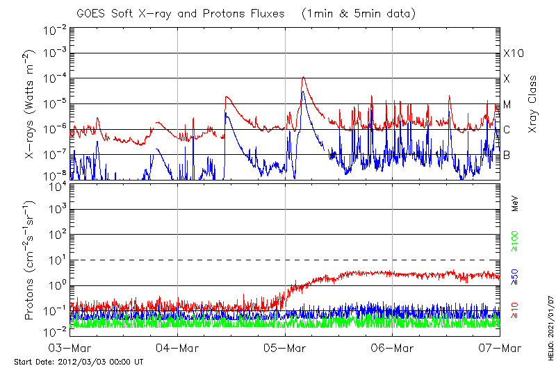 This page provides light-curves generated from GOES soft X-ray and Particle data for the date indicated at the top and the preceding three days.