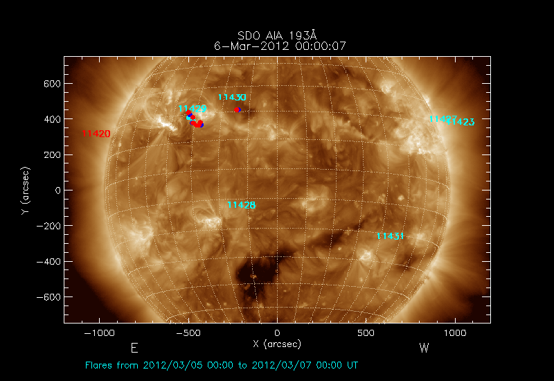 The locations of the flares over-plotted on the image are derived from the flare catalogue