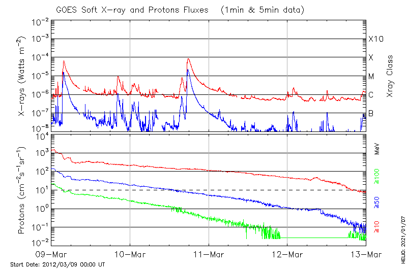 This page provides light-curves generated from GOES soft X-ray and Particle data for the date indicated at the top and the preceding three days.