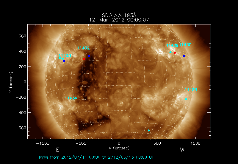The locations of the flares over-plotted on the image are derived from the flare catalogue
