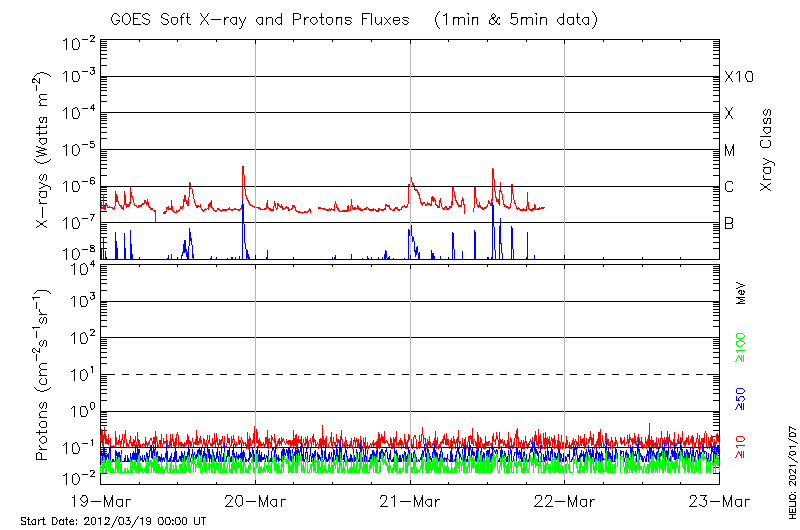 This page provides light-curves generated from GOES soft X-ray and Particle data for the date indicated at the top and the preceding three days.