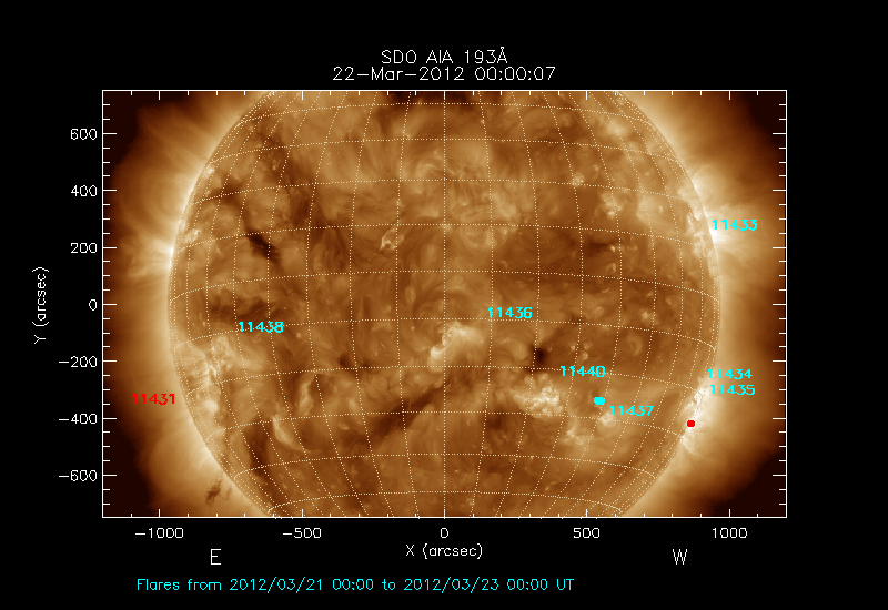 Click on an Active Region plot to display the Region Report including the region evolution and flaring history. HEC Search for NOAA Active Regions (SRS) records for this date and the day before.