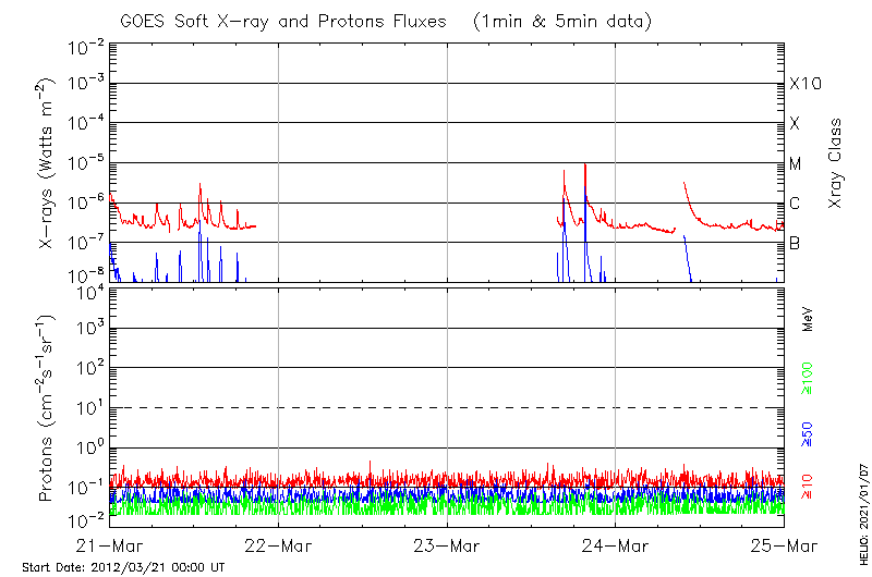 This page provides light-curves generated from GOES soft X-ray and Particle data for the date indicated at the top and the preceding three days.