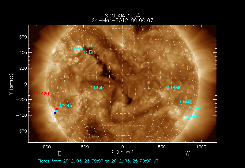 The most recent flares (≤12 hours) are shown as red dots, 12-24 hours ago as blue dots and older ones as turquoise dots.