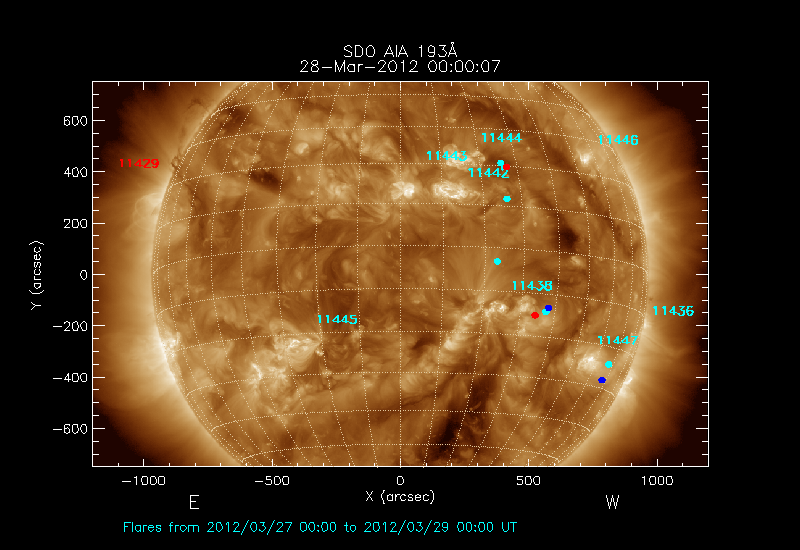 The most recent flares (≤12 hours) are shown as red dots, 12-24 hours ago as blue dots and older ones as turquoise dots.