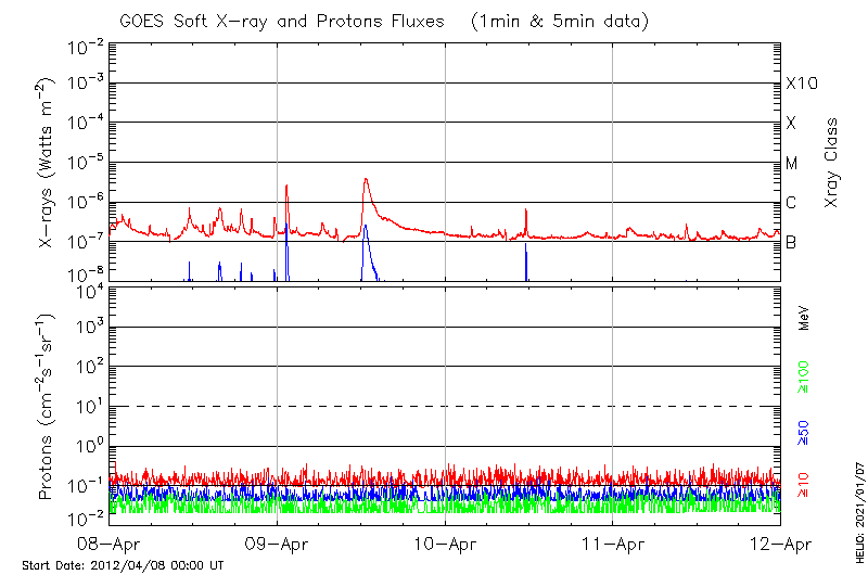 This page provides light-curves generated from GOES soft X-ray and Particle data for the date indicated at the top and the preceding three days.