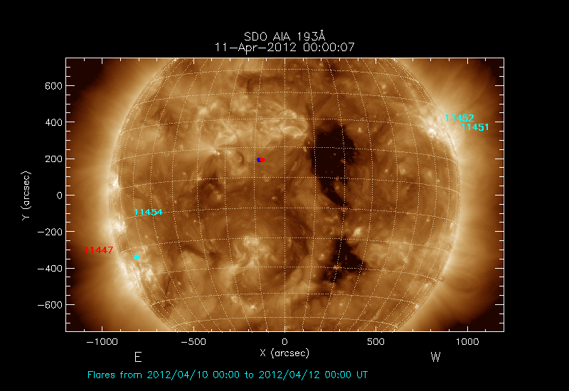 The most recent flares (≤12 hours) are shown as red dots, 12-24 hours ago as blue dots and older ones as turquoise dots.