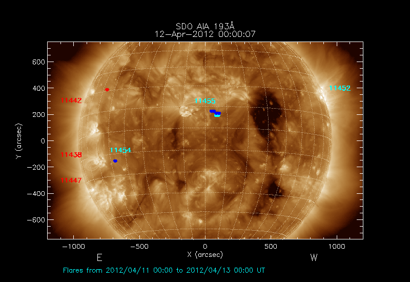 The most recent flares (≤12 hours) are shown as red dots, 12-24 hours ago as blue dots and older ones as turquoise dots.