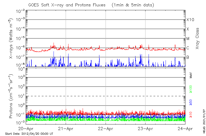 This page provides light-curves generated from GOES soft X-ray and Particle data for the date indicated at the top and the preceding three days.