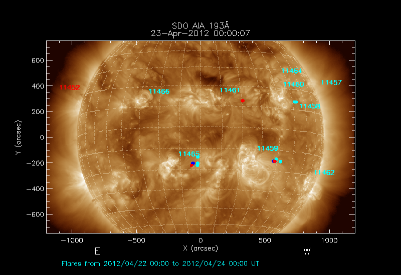 The most recent flares (≤12 hours) are shown as red dots, 12-24 hours ago as blue dots and older ones as turquoise dots.