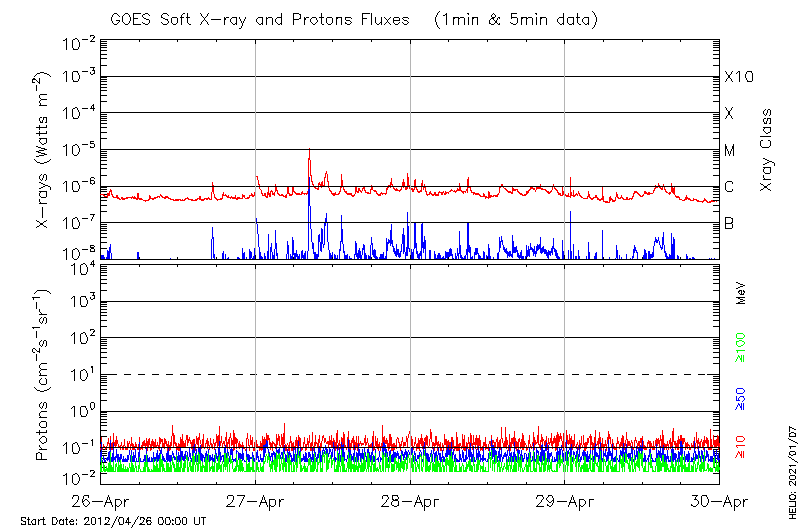 This page provides light-curves generated from GOES soft X-ray and Particle data for the date indicated at the top and the preceding three days.