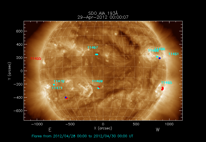 The most recent flares (≤12 hours) are shown as red dots, 12-24 hours ago as blue dots and older ones as turquoise dots.