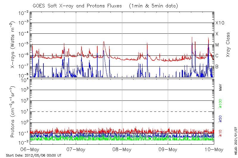 This page provides light-curves generated from GOES soft X-ray and Particle data for the date indicated at the top and the preceding three days.