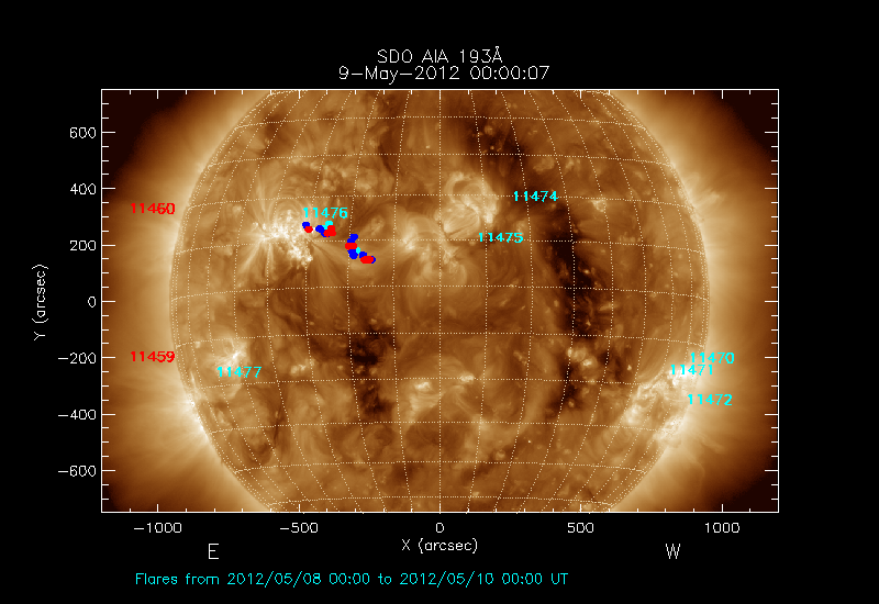 dots and 24-48 hours as turquoise dots; the flare locations are rotated to the time of the image.