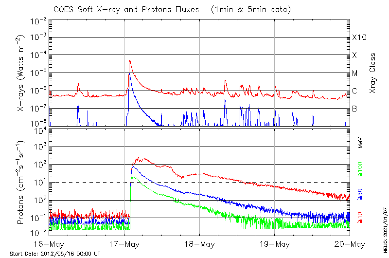 This page provides light-curves generated from GOES soft X-ray and Particle data for the date indicated at the top and the preceding three days.