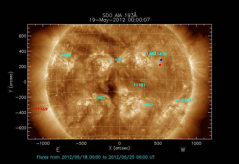 The most recent flares (≤12 hours) are shown as red dots, 12-24 hours ago as blue dots and older ones as turquoise dots.