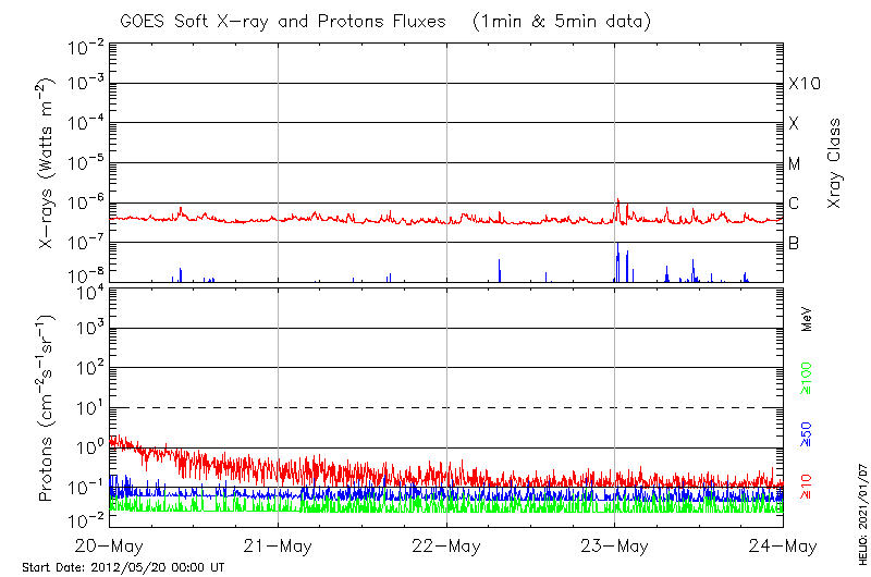 This page provides light-curves generated from GOES soft X-ray and Particle data for the date indicated at the top and the preceding three days.