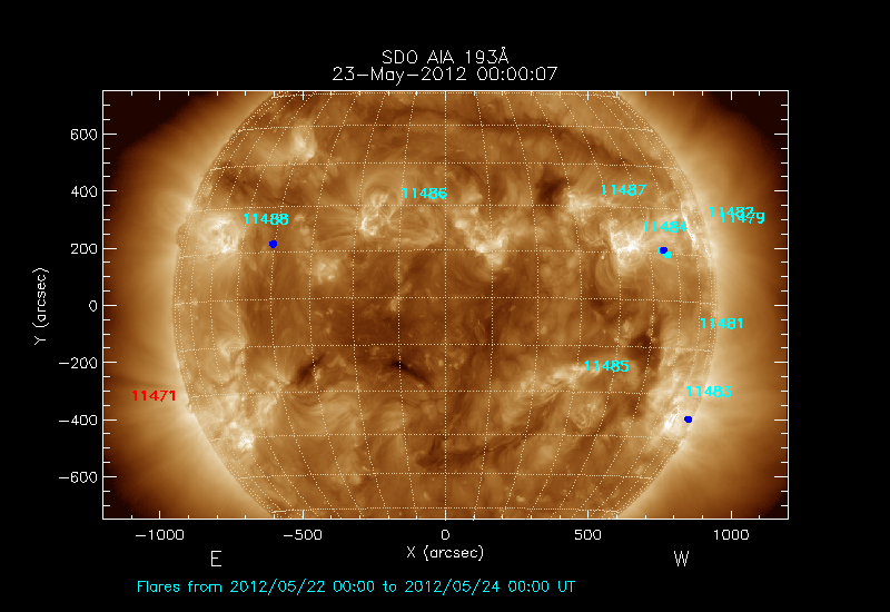 Click on an Active Region plot to display the Region Report including the region evolution and flaring history. HEC Search for NOAA Active Regions (SRS) records for this date and the day before.